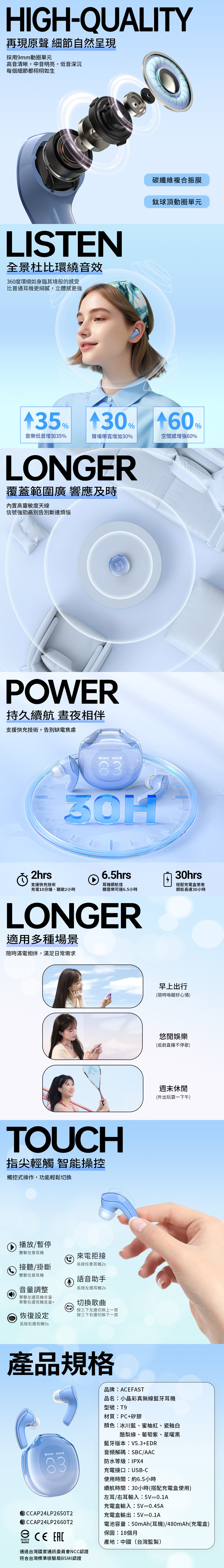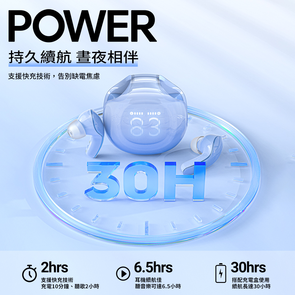 •耳機續航力6.5小時,搭配充電盒長達30小時