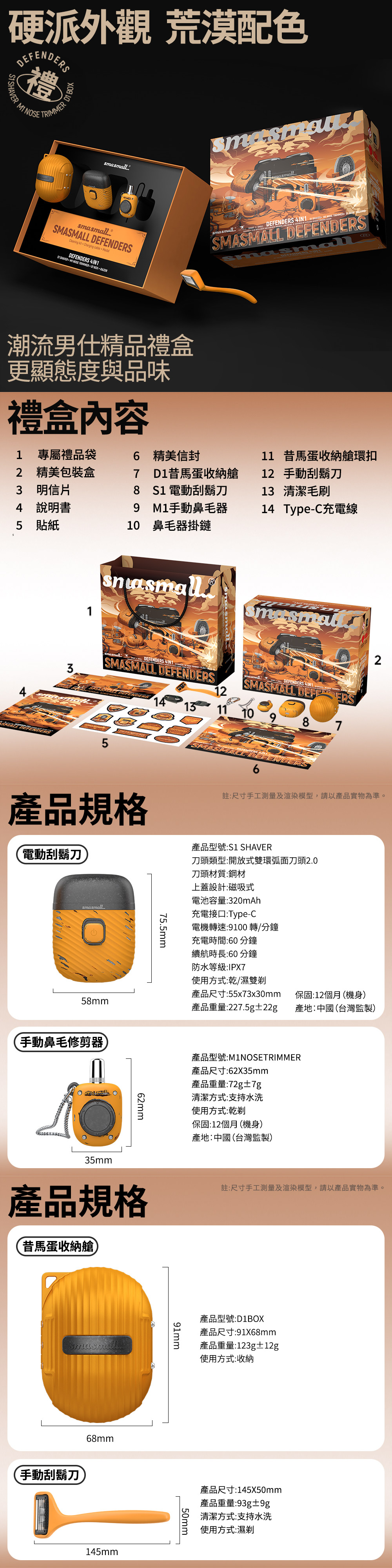 •禮盒內容:電動刮鬍刀*1、手動鼻毛修剪器*1、手動刮鬍刀*1、昔馬蛋收納艙*1、配件